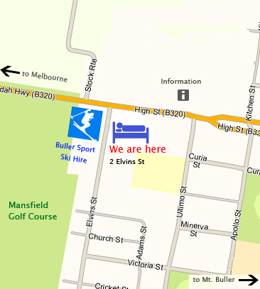 The Mansfield Valley Motor Inn is located on Maroondah Highway (High Street) at the corner of Elvins Street,